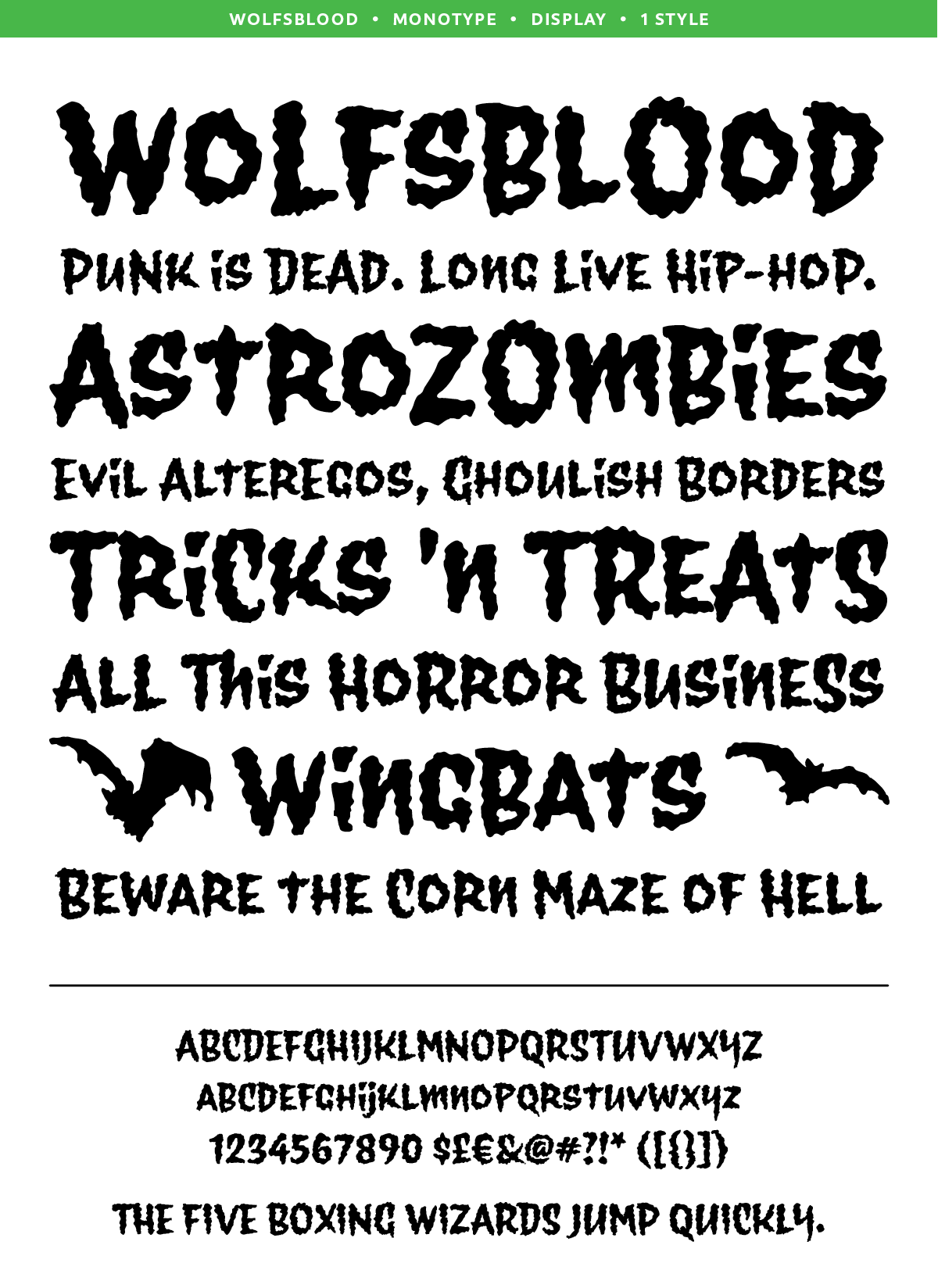 The style can be traced back further to Hollywood and the explosion of low-budget exploitation, horror and sci-fi films, which also had an influence in punk rock. Wolfsblood captures this bizarre dark-spirited lettering which has become a staple in the designer‘s work for bands and posters. The Wolfsblood font has an expanded character set with borders, dingbats (yes, Bats!), and contextual ligatures programmed to give the typeface a random appearance by default.